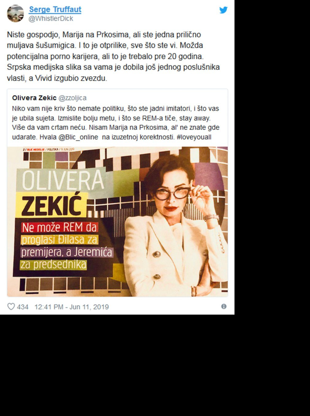 - Niste gospođo, Marija na Prkosima, ali ste jedna prilično muljava šušumigica. I to je otprilike, sve što ste vi. Možda potencijalna porno karijera, ali to je trebalo pre 20 godina - napisao je Trifunović na Tviteru.
