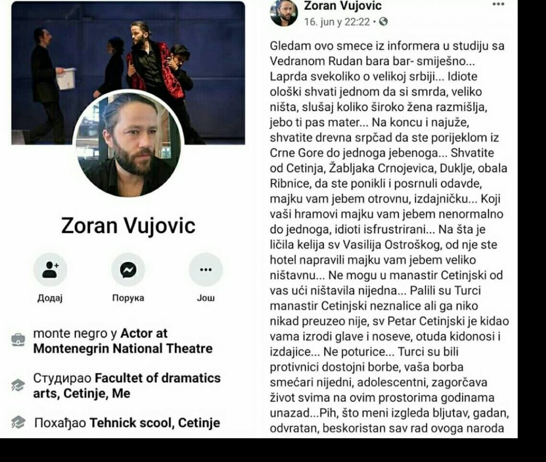 - Gledam ovo smeće iz informera u studiju sa Vedranom Rudan bara bar- smiješno… Laprda svekoliko o velikoj srbiji… Idiote ološki shvati jednom da si smrda, veliko ništa, slušaj koliko široko žena razmišlja, jebo ti pas mater… Na koncu i najuže, shvatite drevna srpčad da ste porijeklom iz Crne Gore do jednoga jebenoga… Shvatite od Cetinja, Žabljaka Crnojevića, Duklje, obala Ribnice, da ste ponikli i posrnuli odavde, majku vam jebem otrovnu, izdajničku… Koji vaši hramovi majku vam jebem nenormalno do jednoga, idioti isfrustrirani… Na šta je ličila kelija sv Vasilija Ostroškog, od nje ste hotel napravili majku vam jebem veliko ništavnu… Ne mogu u manastir Cetinjski od vas ući ništavila nijedna… Palili su Turci manastir Cetinjski neznalice ali ga niko nikad preuzeo nije, sv Petar Cetinjski je kidao vama izrodi glave i noseve, otuda kidonosi i izdajice… Ne poturice… Turci su bili protivnici dostojni borbe, vaša borba smećari nijedni, adolescentni, zagorčava život svima na ovim prostorima godinama unazad…Pih, što meni izgleda bljutav, gadan, odvratan, beskoristan sav rad ovoga naroda koji je digao ruke od sebe…Da su nam vječni djedovi, u grob se prevrću… ŽIVJELI - napisao je Vujović.