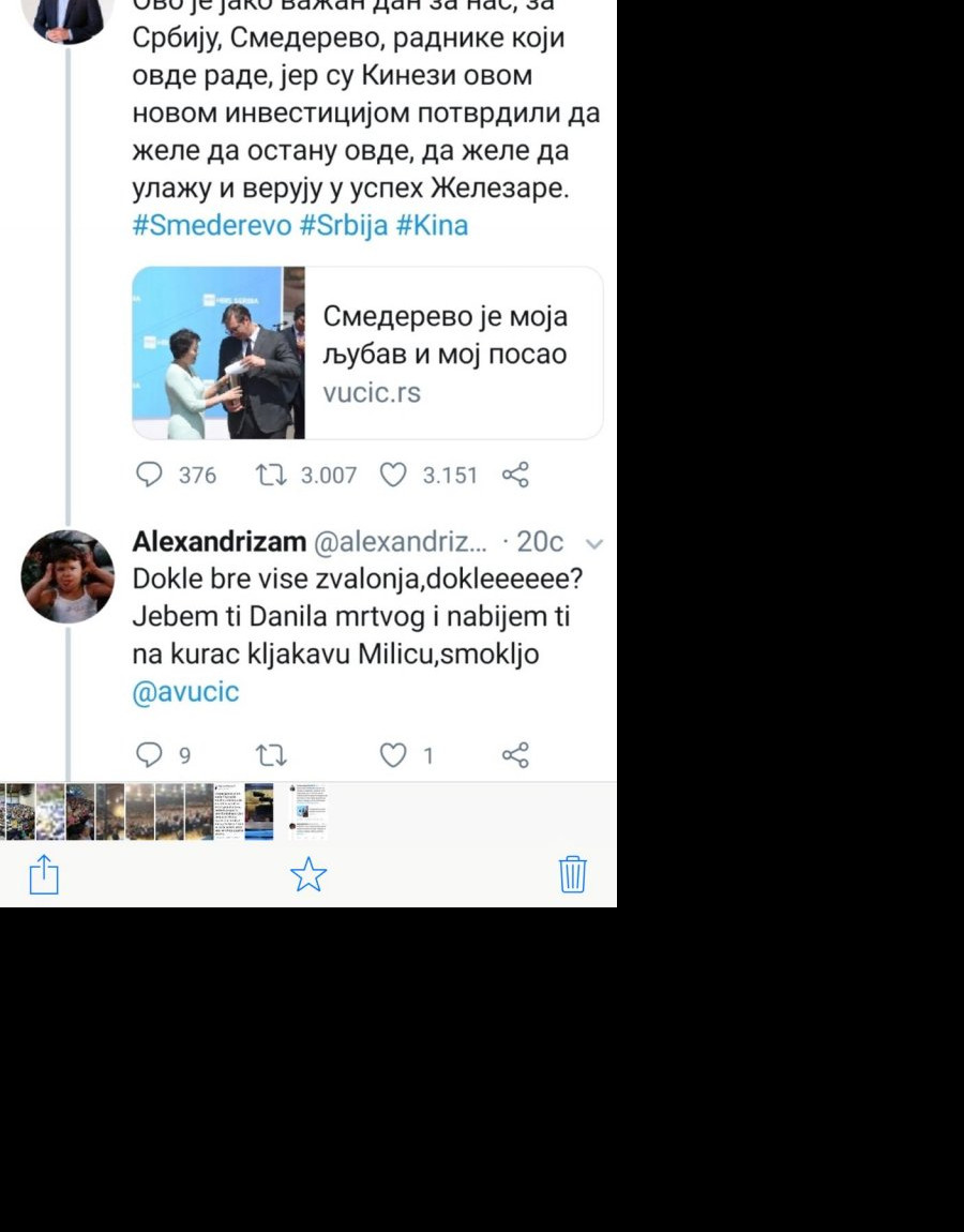 Naime, na tvit na zvaničnom nalogu predsednika Srbije, u kojem je Vučić juče poručio koliko je važno bilo privući kineske investicije u Srbiju, odgovorio je korisnik pod pseudonimom Alexandrizam i uputio gnusne pretnje Vučićevoj deci!