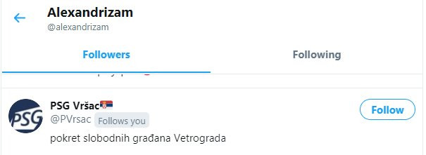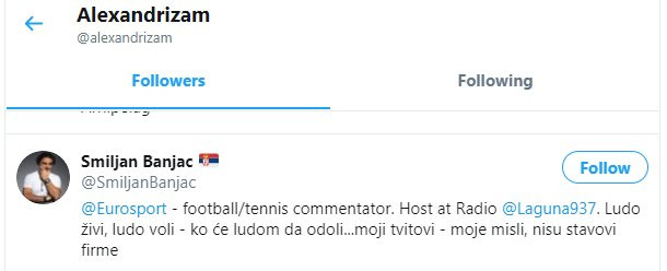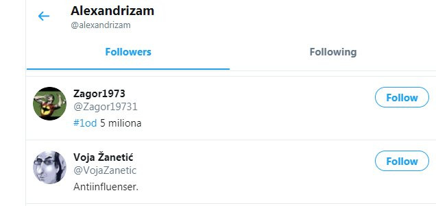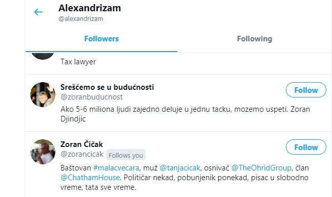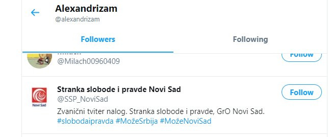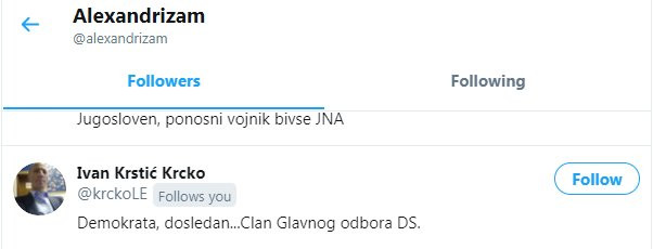 Pregledom spiska pratilaca utvrđeno je da između ostalog ovog idiota na tviteru prate Gradski Odbor stranke Dragana Đilasa u Novom Sadu, stranka Sergeja Trifunovića PSG, član glavnog odbora DS Ivan Krstić, Zoran Čičak, Smiljan Banjac, Voja Zanetić i drugi.