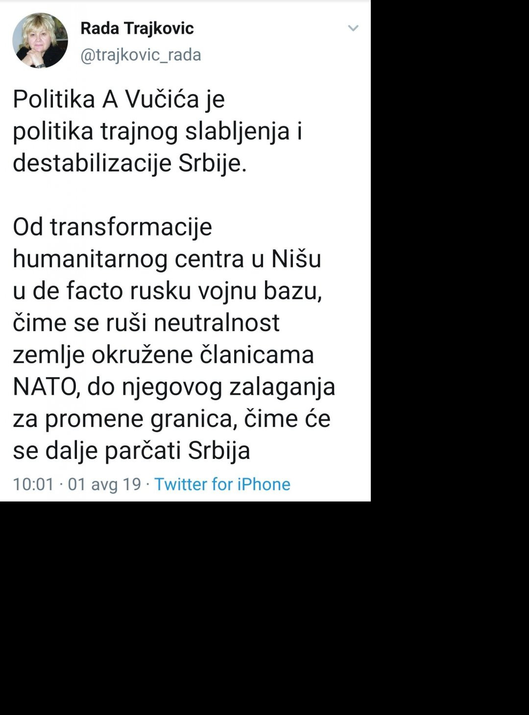 Ona je na svom tviter nalogu, nema sumnje u njihovo ime, još jednom napala predsednika Srbije Aleksandra Vučića jer je, zaboga, "dozvolio Rusima da naprave vojnu bazu u Srbiji"?!