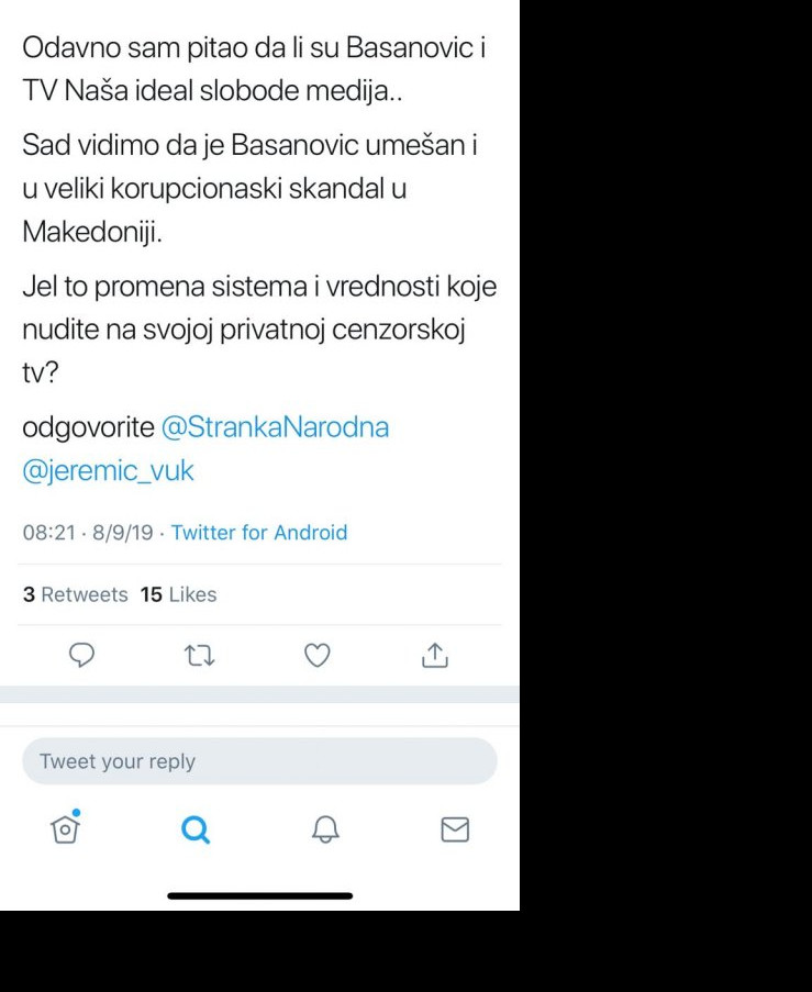 - Odavno sam pitao da li su Bašanović i TV Naša ideal slobode medija. Sad vidimo da je Bašanović umešan i u veliki korupcionaški skandal u Makedoniji. Jel to promena sistema i vrednosti koje nudite na svojoj privatnoj cenzorskoj tv? odgovorite @StrankaNarodna @jeremic_vuk