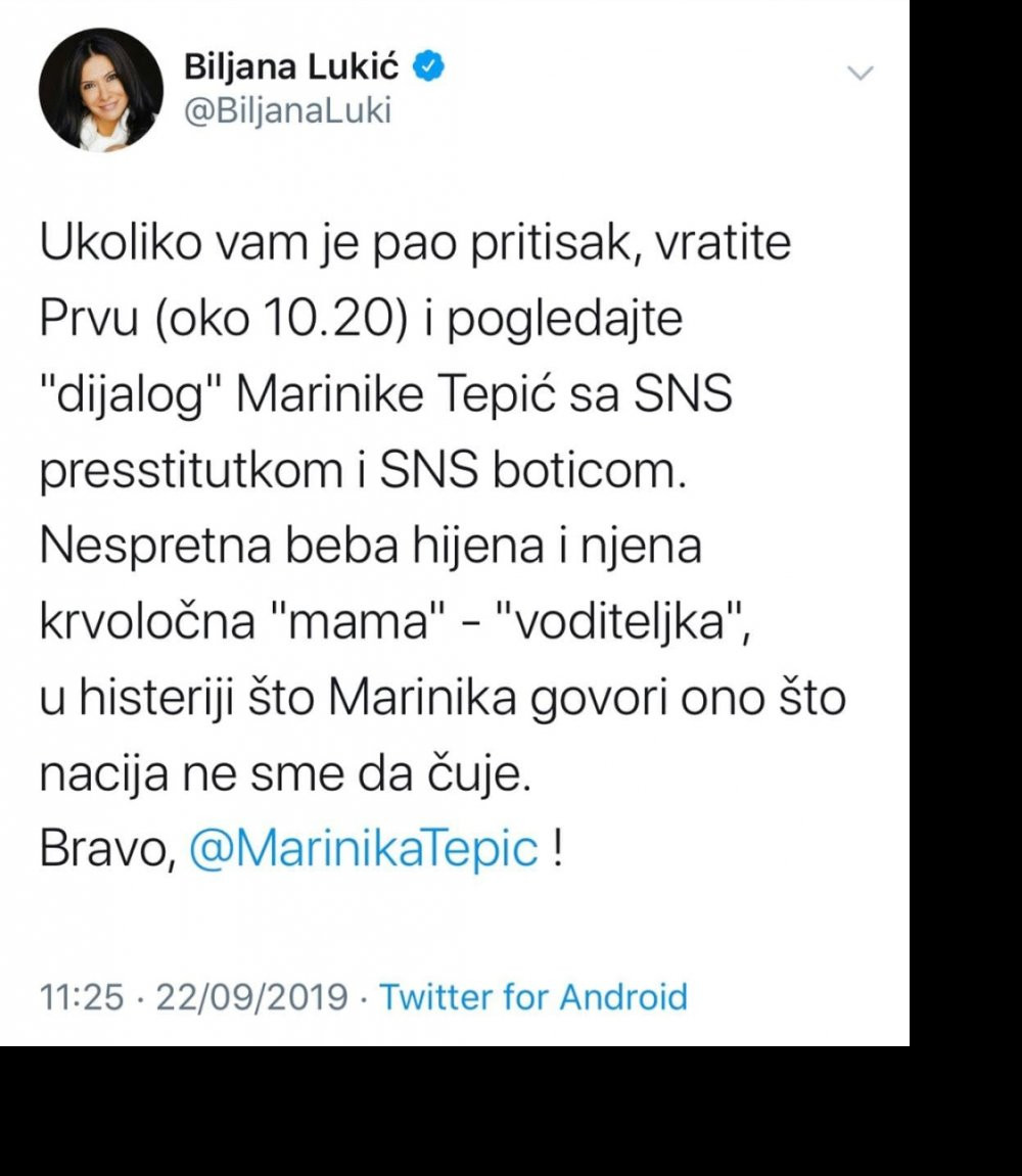 Nakon što su u emisiji "Jutro" na TV Prva gostovale članica Glavnog odbora SNS Bojana Radaković i potpredsednica Stranke slobode i pravde Marinika Tepić, Biljana Lukić se oglasila na tviteru u maniru Đilasovih sindikalaca Željka Veselinovića i nebojše Aleksića koji promovišu silovanje i nasilje nad ženama.