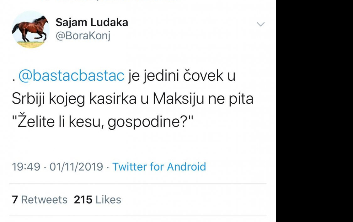 - Bastać je jedini čovek u Srbiji kojeg kasirka u Maksiju ne pita: "Želite li kesu gospodine?"