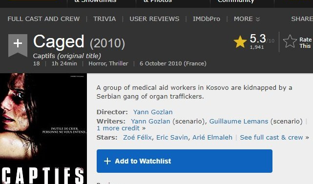 Naime, film se zove "Captifs", odnosno "Zarobljenici" i bavi se trgovinom organa na Kosovu, ocenjen je ocenom 5,3 od 10 i klasifikovan je u horor/triler.