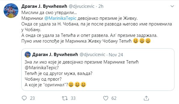 Kao što se vidi u objavi, glavni i odgovorni urednik Informera samo je pitao za devojačko prezime Tepićke, s obzirom na to da je poznato da joj je prezime prvog muža Čobanu. Objavljivanje nečijeg prezimena, koliko je poznato, nije kršenje zakona.