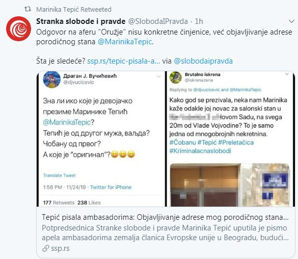 Kao što se vidi na prethodnoj fotografiji, glavni i odgovorni urednik Informera Dragan J. Vučićević nije objavio njenu adresu, već je to učinio neko od tviteraša ispod njegove objave. Koliko je poznato, ne može se optužiti osoba koja je objavila tvit na koji je neko reagovao, ali Marinika je izgleda navikla da optužuje nasumice, kako joj u tom trenutku odgovara.