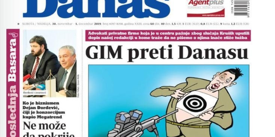 Niskotiražni list "Danas" na sutrašnjoj naslovnoj strani ima karikaturu predsednika Aleksandra Vučića koji na majici ima metu, a u njega je uperen snajper.