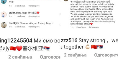 "Voljni smo da podržimo Srbiju", "Stara izreka kaže kada prijatelju treba pomoć, pravi prijatelj će mu pomoći", "Pomoći ćemo vam i želimo to, jer smo prijatelji", "Mi Kinezi smo uvek uz Srbiju", "Zajedno smo", "Prebrodićemo ovo zajedno i posetićemo vašu zemlju čim se stvari poboljšaju", samo su neke od poruka koje su napisali građani Kine.