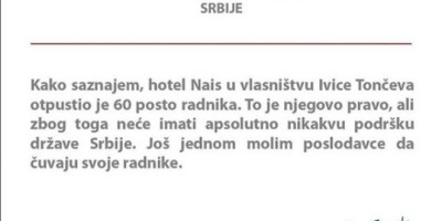 - Kako saznajem, hotel Nais u vlasništvu Ivice Tončeva otpustio je 60 odsto radnika. To je njegovo pravo, ali zbog toga neće imati apsolutno nikakvu podršku države Srbije. Još jednom molim poslodavce da čuvaju svoje radnike - napisao je Vučić na Instagram profilu "budućnostsrbije".
