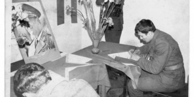 Fotografija prikazuje kako vojnik - gardista Dragan Marković potpisuje zakletvu Vojsci SFR Jugoslavije u kasarni u Puli oktobra 1979. godine.