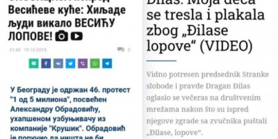 - ”Snimaš” pita Đilas kamermana pre nego što počne loša gluma, plakanje i strašne i ružne optužbe na račun predsednika Vučića. Aleksandar Vučić kao i bilo ko iz naše stranke NIKADA nisu javno pomenuli Đilasovu decu. Za razliku od nas, Đilas se bavio Vučićevom decom. Đilas je na naslovnim stranama svojih novina, Danas i Vreme, objavljivao slike Vučićeve dece. U istim novinama lažno su optuživali Vučićevu decu i širili neistine o njima. Kada se Vučićev sin razboleo Đilasovi saradnici su mu preko društvenih mreža poručivali da ”završi na respiratoru”. Linč političkih protivnika u Srbiji je uveo baš Dragan Đilas. Pa on je slao crnogorskog kriminalca Marka Bastaća na vrata mog stana. Isti taj Đilas je slao kolonu demonstranata da stoje ispred moje zgrade i prete meni i mojoj porodici. I sada bi Đilas da za ono što on radi optuži druge iako to ne rade. To se zove zamena teza. I loša gluma - navodi zamenik gradonačelnika Beograda Goran Vesić.