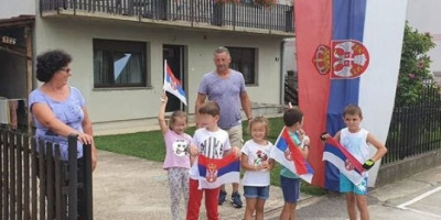 Tako je predsednika ispred jedne kuće u Banjaluci, dočekalo petoro mališana u drustvu roditelja, sa zastavama Srbije, dok je pored njih, uz ogradu bila razvijena velika srpska trobojka.