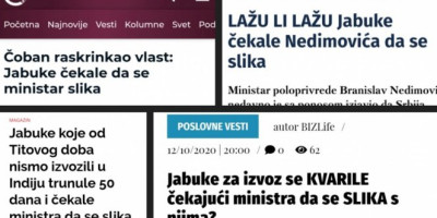 Za novu masnu laž uperenu protiv aktuelne vlasti đilasovski mediji iskoristili su izjavu vlasnika "Color-press grupe" Roberta Čobana koji je za N1 izjavio da je izvoz jabuka nekoliko puta odlagan jer u ministartsvu poljoprivrede nisu znali koga da pošalju da se slika sa jabukama.