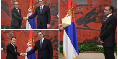 - Predsednik Republike Srbije Aleksandar Vučić primio je akreditivna pisma novoimenovanih ambasadora - Švajcarske Konfederacije Ursa Šmida, Japana Takahiko Kacumate i Republike Kipar Dimitriosa Teofilaktua - piše na Instagramu.