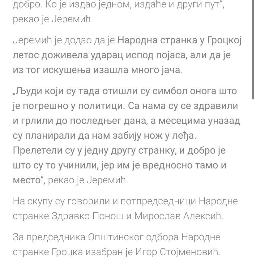 - Ljudi koji su tada otišli su simbol onoga što je pogrešno u politici. Sa nama su se zdravili i grlili do poslednjeg dana, a mesecima unazad su planirali da nam zabiju nož u leđa. Preleteli su u jednu drugu stranku, i dobro je što su to učinili, jer im je vrednosno tamo i mesto - rekao je Jeremić.