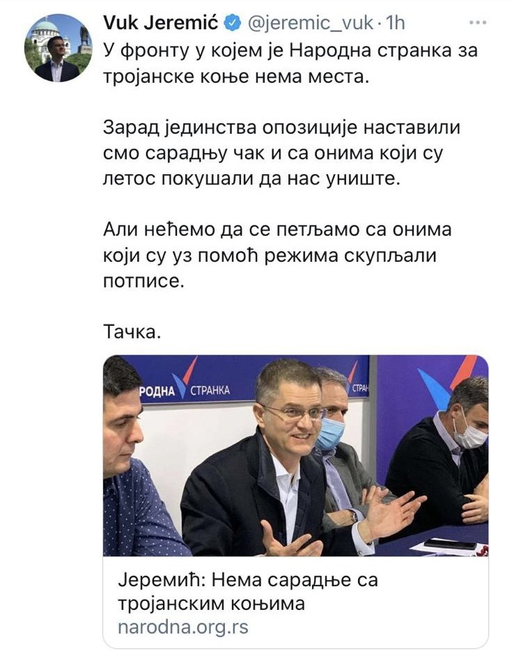 Lider Narodne stranke Vuk Jeremić još jednim gestom je pokazao da je srpska opozicija na aparatima. On je retvitovao poruku Slobodana Prvanovića, naučnog saradnika na Institutu za fiziku, koji smatra da Dragan Đilas mora ozbiljno da se pokaje zbog svojih političkih poteza