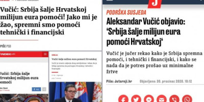 Na naslovnim stranama najčitanijih internet portala u Hrvatskoj i BiH je vest da će Srbija na inicijativu predsednika Vučića Hrvatskoj uputiti pomoć u iznosu od milion evra za sanaciju štete izazvane katastrofalnim zemljotresom u kome je do sada život izgubilo čak sedam osoba.