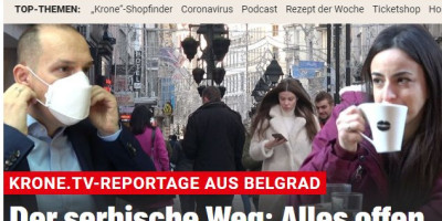 "Knez Mihailova, glavna ulica u pešačkoj zoni oko ručka. Mnogo je aktivnosti. Ljudi se šetaju i upijaju zimsko sunce u uličnim kafićima. Ispred prodavnica se stvaraju redovi, poštuje se minimalna udaljenost (1,5 metar) i maske se nose. Dozvoljene su sve vrste - uključujući štitnike za lice u restoranima. Dok je broj infekcija u prvom talasu korone bio veći nego u Austriji, situacija se smirila u narednim mesecima.