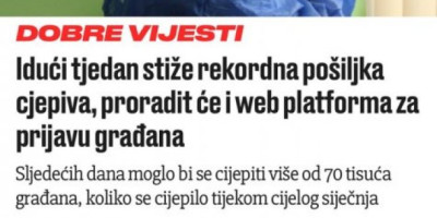 Kako piše Jutarnji list, sledeće nedelje će u Hrvatsku stići rekordna pošiljka vakcina i da će proraditi internet platforma za prijavu građana za vakcinaciju.