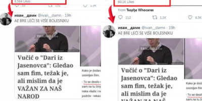 Njih dvoje su označili sa "sviđa mi se" objavu jednog korisnika Tvitera u se navodi da je Aleksandar Vučić "bolesnik" i da treba "da se leči" samo zato što je rekao da je gledao film Dara iz Jasenovca i da je inicijativa da se film o stradanju Srba u Jasenovcu snimi bila njegova.