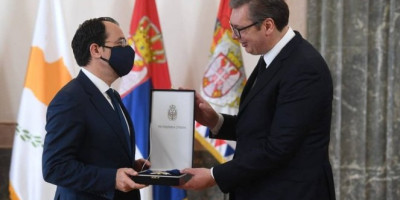 Predsednik Srbije Aleksandar Vučić uručio je danas ministru inostranih poslova Kipra Nikosu Hristodulidisu Orden srpske zastave prvog stepena