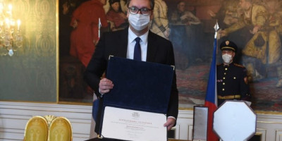 Na jučerašnjoj ceremoniji dodele odlikovanja u Praškom zamku, predsednik Srbije je češkom kolegi Zemanu uručio "Orden Republike Srbije na lenti".