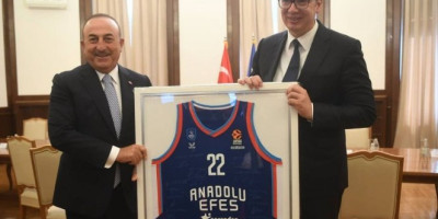 Čavušoglu je Vučiću poklonio dres aktuelnog evropskog šampiona u košarci Efes Pilsena s brojem 22, koji nosi MVP Evrolige, srpski reprezentativac Vasilije Micić.