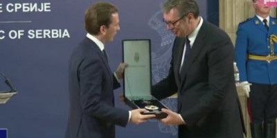 Predsednik Srbije je zatim kancelaru Austrije uručio Orden Republike Srbije na lenti, za zasluge u unapređenju odnosa sa Srbijom i celim regionom Zapadnog Balkana.