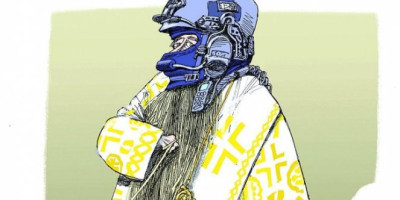 U novom izdanju Nedeljnik na karikaturi ima mitroploita Joanikija koji na sebi ima kacigu pokraj koje je telefon, a umesto kandila u ruku su mu stavili bombu.