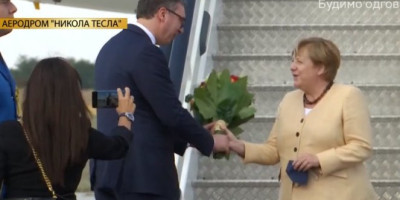 Takođe, i prilikom ulaska kancelarke u službeni automobil, Vučić koji će koji se sa Merkel sastati u 18. časova, joj se obratio na nemačkom: "Do skorog viđenja".