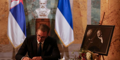 Nakon upisivanja u knjigu žalosti, predsednik Vučić se poklonio pred Dudinom fotografijom.