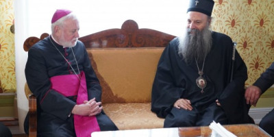 Šef diplomatije Vatikana je novinarima rekao da je patrijarhu Porfiriju preneo pozdrave naklonosti pape Franje sa kojim se, kako je rekao, srpski patrijarh više puta sreo.