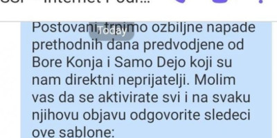 Naređenje glasi - Da se na Tviteru dva naloga napadaju da su za SNS, da se za nalog "Bora Konj" i "Samo Dejo" što češće naglašava da su za režim i da se udruženo omalovaže. Čak postoji i šablon po kojem treba da budu napadani.