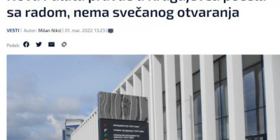 - Palata pravde, za sada nije svečano otvorena iako je 28. februara predsedenik Srbije Aleksandar Vučić automobilom prošao na samo 600 metara od ovog objekta i svečano otvorio radove na izgradnji nemačke fabrike Vaker-Nojsen u Kragujevcu - piše na N1.