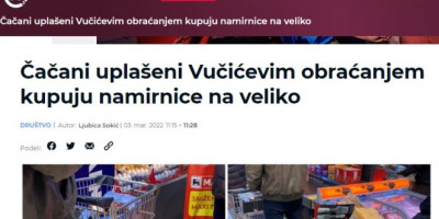 Oni su obraćanje predsednika Srbije Aleksandra Vučića o stanju u zemlji i svetu iskoristili kao priliku da, potpuno neosnovano, isprozivaju vlast, ali i da pokušaju da među građane unesu paniku i neizvesnost. Kako, naime, tvrde u tekstu koji su danas objavili, "Čačani uplašeni Vučićevim obraćanjem kupuju namirnice na veliko".