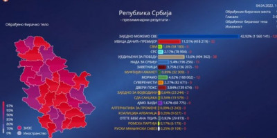 Na osnovu 95,75 odsto obrađenih biračkih mesta koje je obradila Republička izborna komisija (RIK), trenutno najviše glasova na parlamentarnim izborima ima koalicija okupljena oko SNS "Zajedno možemo sve", sa 42,92 odsto, što je oko 120 poslaničkih mesta