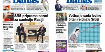 Tako je na jučerašnjoj naslovnoj strani "Danasa" dobinirao naslov: "Vučić sprema narod za sankcije", dok već danas imamo totalni preokret i glavni naslov: "Pošto je rekao za FT da ne uvodi sankcije - Vučić misli samo na svoj rejting!"