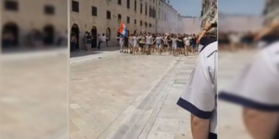 Juče su dubrovački maturanti prošetali Stradunom urlajući na sav glas "Za dom spremni" i pevajući ustaške pesme, jedan od njih maše zastavom na kojoj se nalazi grb s prvim belim poljem, dok su dva učenika osobu koja ih je snimala pozdravljali nacističkim pozdravom.