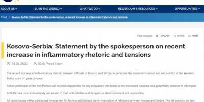 Evropska spoljnopolitička služba (EEAS) upozorila je danas da nedavni porast zapaljive retorike između zvaničnika Beograda i Prištine, a "posebno izjave o ratu i sukobima na Zapadnom Balkanu", izazivaju veliku zabrinutost?!? Ova služba EU upozorava da će za svaku eksalaciju i povećanje tenzija na KiM biti odgovorni političari sa obe strane... Jedino nije jasno za šta je to Beograd odgovoran, kad naši političari samo reaguju na ludilo Prištine