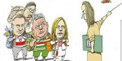 - Prevešćemo karikaturu. Prvi kadar: na njemu su četiri đaka (premijer Mađarske Viktor Orban, buduća italijanska premijerka Đorđa Meloni, poljski predsednik Andžej Duda i Aleksandar Vučić). Na drugom je "Historia magistra vitae est" (učiteljica, dakle) koja prutom pokazuje ka zloglasnom nacističkom logoru Aušvicu (treći kadar). Poruka jasna ko hoće da vidi: Gospodo, to što sada i kako radite, u budućnosti može da vodi ovome. Dakle, ne šalje Petričić ovo četvoro u Aušvic na izdržavanje "pravedne istorijske kazne", kako je shvatila i napisala gospođa Srbljanović, već ih apostrofira kao moguće pošiljaoce drugih. Ako joj nije jasno zašto baš oni, neka im se o nazorima, ideologijama i delima raspita makar na Vikipediji. U čudu će se naći - pokušao je da se opravda Pivljanin koji je takođe istakako da, tobože, ne pravimo od "Nove" "Šarli ebdo".