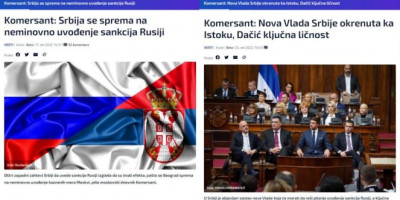 Naslovi u "Komersantu" za samo osam dana promenili su se iz korena. Prvi tekst govori kako će nova Vlada Srbije sigurno uvesti sankcije Rusiji, a drugi, potpuno suprotno. Da je nova Vlada proruska i da je čvrsto okrenuta ka istoku.