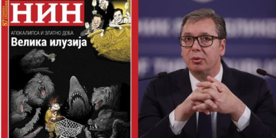 Naslov “Apokalipsa i zlatno doba: Velika iluzija” ilustrovali su karikaturom na kojoj je prikazan muškarac u ritama, sa srpskom zastavom, koji gura prazna kolica. On je okružen zverima kao što su medved, lav, tigar, krokodil, ajkula, ali i zmijom, divljom svinjom i lešinarom.