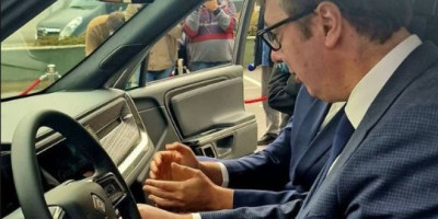 Vučić je seo za volan automobila, čija tabla je u potpunosti digitalizovana i u koju je ugrađen i gugl asistent Aleksa, i opet se našalio: