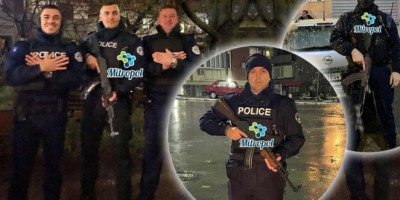 Kako se može videti po slikama, na raskrsnici ispod Medicinske škole u Severnoj Mitrovici policija lažne države pozirala je imitirajući rukama dvoglavog orla.