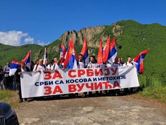 Srbi iz Severne Mitrovice i Leposavića nose zastave Srbije, odeveni su u majice na kojima piše "Za Srbiju, za Vučića, Srbi sa Kosova i Metohije" i nose transparent sa istim tekstom.