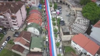 Okupljeni građani u Zvečanu razvili su trobojku dugačku 250 metara na glavnoj ulici ispred zgrade Opštine Zvečan, ispred koje su i dalje pripadnici KFOR-a u kordonu sa opremom za razbijanje demonstracija.