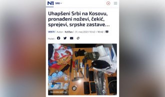 Tajkunski medij N1 o tome šta je navodno pronađeno kod uhapšenih Srba pored navedenih noževa i čekića, u isti koš su stavili i srpsku trobojku.