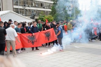 Za sada se okupilo nešto više od 100 građana, demonstranti uzvikuju „UČK, UČK“, uz istaknute zastave Albanije, ali i jedna zastava lažne države Kosovo. Ono što privlači pažnju jeste kod drži zastavu samoproklamovane države: muškarac u maslinastvo zelenoj garderobi koji ima kapuljaču preko i masku preko lica.
