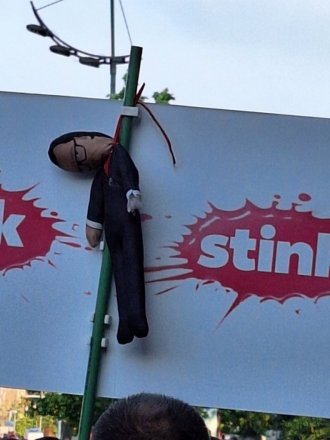 Čekaj bre, prvo kažete "Vučiću, ti si podmetnuo nekoga na miting s lutkom i vešalima, hajde dovedi krivca, uhapsi ga", a onda država pronađe krivca i uhapsi ga i ispostavi se da je on Vučićev ljuti protivnik i onda kreće spin "E pa, Vučiću, nije krivično delo pozivati na tvoje ubistvo, pusti čoveka".
